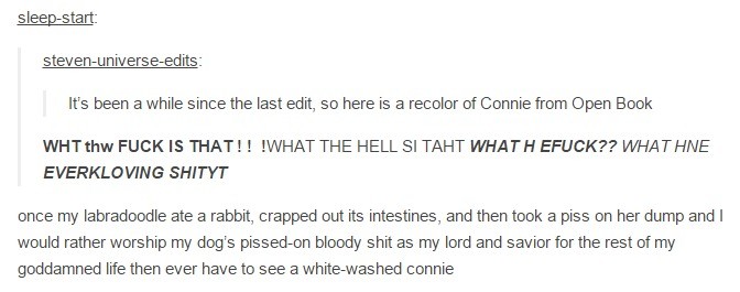 Whitewash fanart postavičiek zo seriálu Steven Universe nemusel na nahnevané reakcie fandomu dlho čakať. Mimochodom, opak sa stáva pravidelne, postavy pôvodne bielej farby pokožky sú na Tumblr zobrazované ako príslušníci inej rasy veľmi často a nikomu to nevadí.